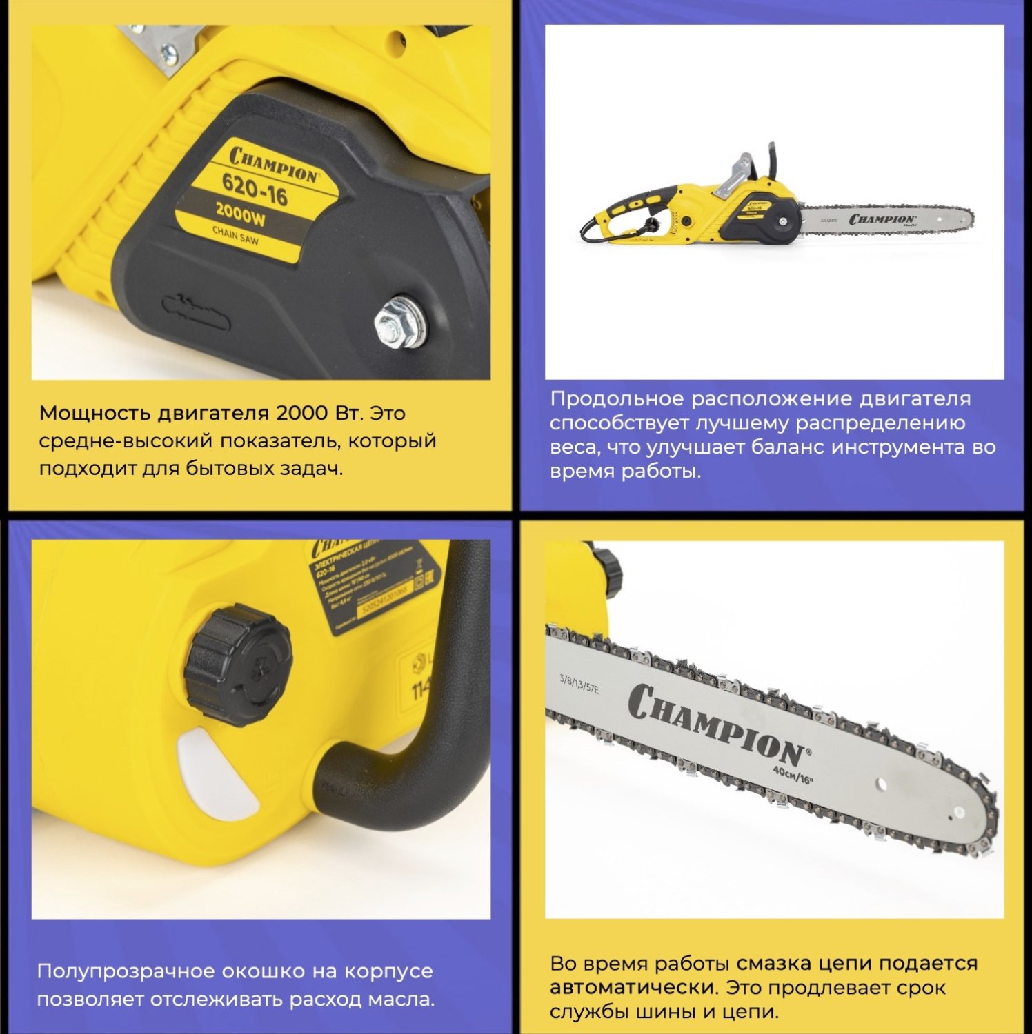 Электропила CHAMPION 620-16” сочетает в себе оптимальную мощность, удобство и лёгкость. С двигателем на 2 кВт и шиной длиной 16 дюймов (40 см), она подходит для работ по обрезке деревьев, заготовке дров, пилению досок и других бытовых задач.