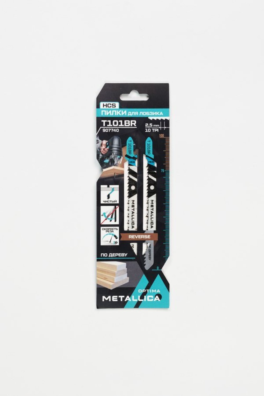 Пилки для лобзика METALLICA Optima T101BR, 100/75мм шаг 2,5мм, HCS обрат/зуб, чист. рез, по дер. 2шт