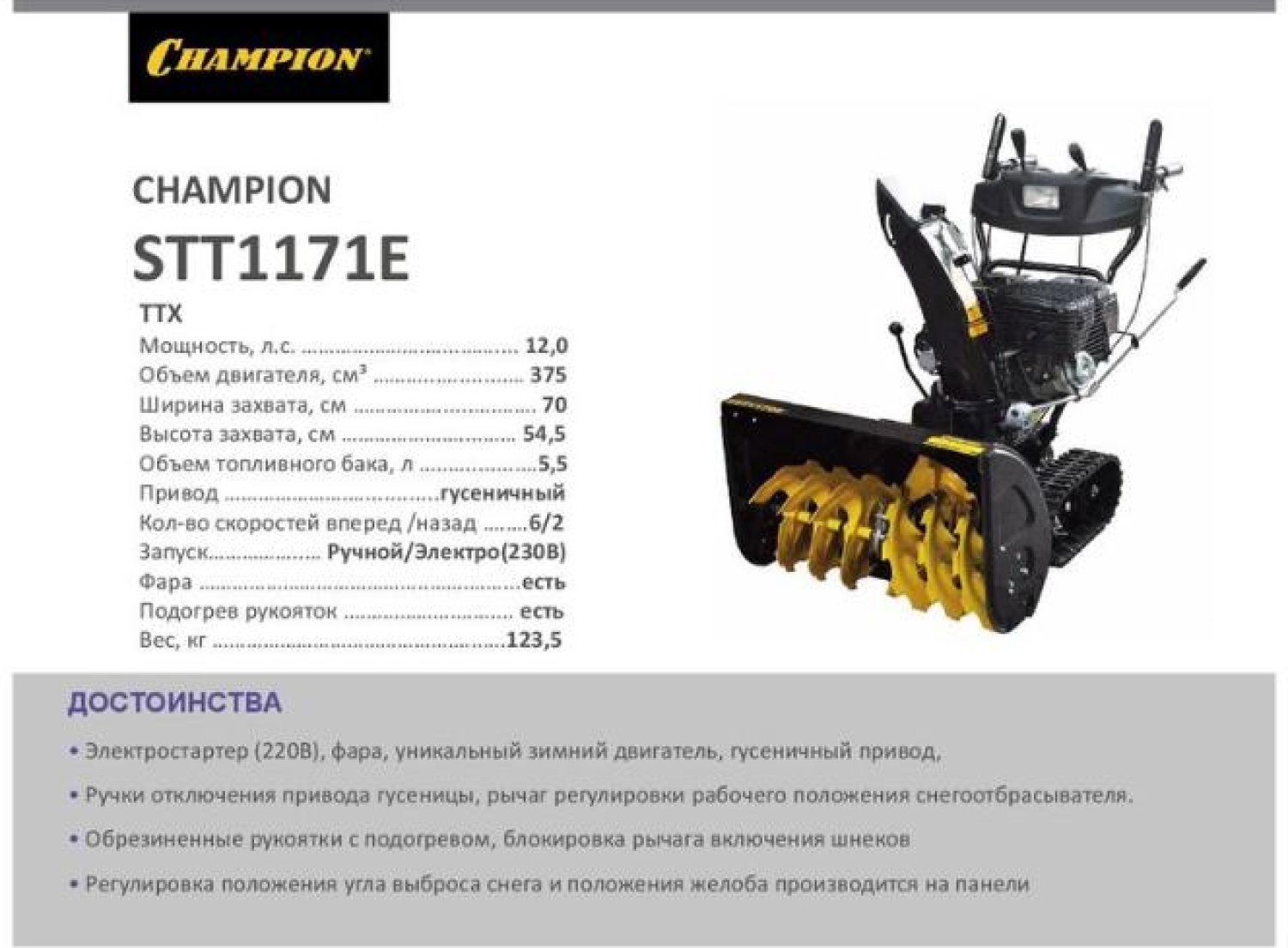 Снегоуборщик бензиновый Champion STT1171E - это профессиональный снегоуборщик, предназначеный для уборки тяжелого слежавшегося снега и наледи на больших площадях. Основным преимуществом этой модели является гусеничный привод, позволяющий использовать машину на обледенелых участках и склонах.